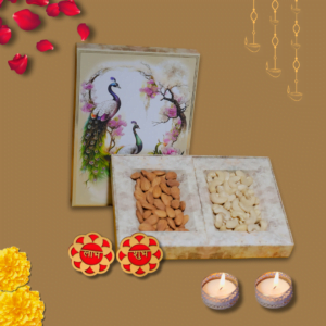 CelebrationsPeacock 2 Compartment Box – Premium Gifting Pack of Almonds & Cashews (with Complimentary Diyas & Shubh Laabh)