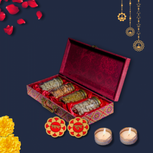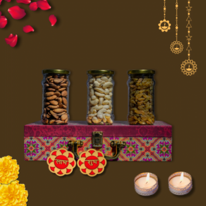 CelebrationsRed Traditional 3 Jar Box – Cashews, Raisins & Almonds (with Complimentary Diyas & Shubh Laabh)