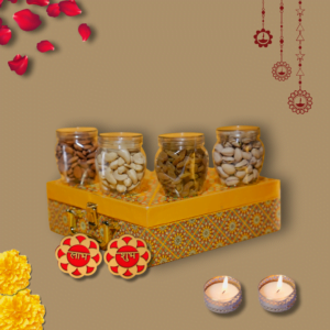 CelebrationsYellow Traditional 4 Jar Box – Cashews, Raisins, Almonds & Pistachios (with Complimentary Diyas & Shubh Laabh)