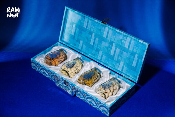 The Blue Traditional Jar 4 features premium cashews, raisins, California almonds, and pistachios in a beautifully designed package. Perfect for gifting, it offers a delightful and nutritious treat for any occasion.