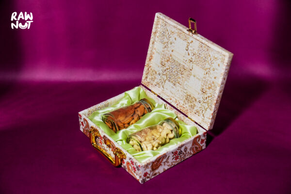 The Cream Kairi 2 Jar Box is a charming gift set that combines simplicity with elegance. This beautifully designed box features two jars filled with premium Cashews and Almonds, offering a perfect blend of taste and health. The soft cream color and delicate design make it an ideal gift for any occasion, whether it’s a festive celebration or a thoughtful gesture for a loved one.