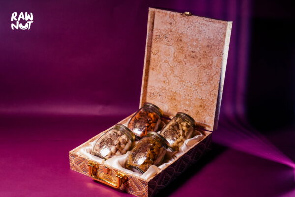 The Cream Traditional 4 Jar Box features premium cashews, raisins, almonds, and pistachios in a beautifully designed package. Perfect for gifting, it offers a delightful and nutritious treat for any occasion.