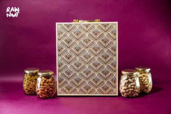 The Cream Traditional 4 Jar Box is an elegantly crafted gift set that combines tradition with a touch of sophistication. This beautiful box features four jars filled with premium Cashews, Raisins, Almonds, and Pistachios, offering a perfect balance of flavor and nutrition. The soft cream design, adorned with traditional patterns, makes it an ideal gift for any special occasion, adding a touch of grace to your celebrations.