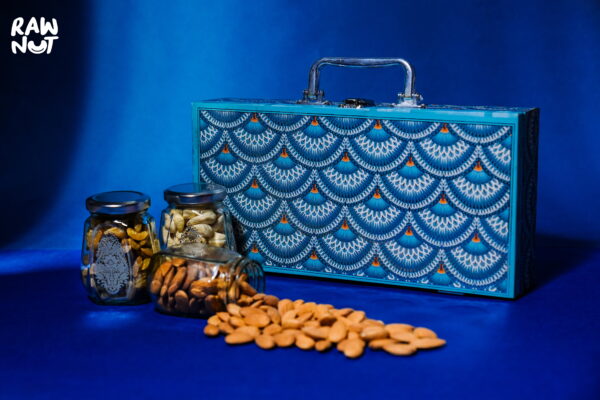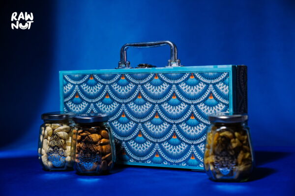 The Blue Traditional 3 Jar Box features premium almonds, cashews, and raisins in a beautifully designed package. Perfect for gifting, it offers a delightful and nutritious treat for any occasion.