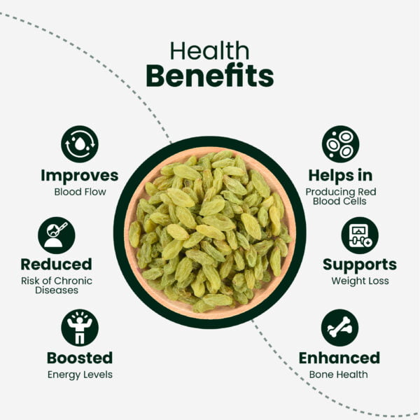 The potassium content in raisins helps regulate blood pressure levels thus reducing the risk of cardiovascular diseases.