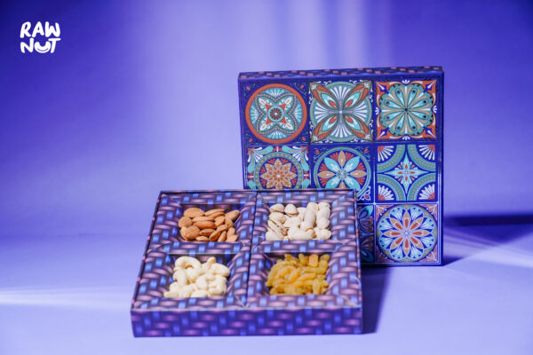 Gift the perfect blend of tradition and taste with the Blue Traditional 4 Compartment Box. This beautifully designed box features a selection of RawNut’s finest cashews, green raisins, California almonds, and pistachios. Ideal for any special occasion, it offers a delightful and nutritious treat for your loved ones.