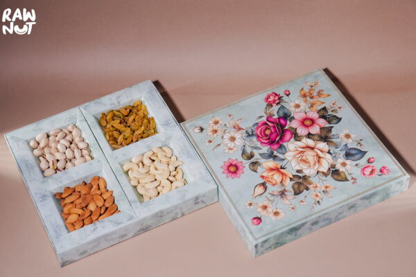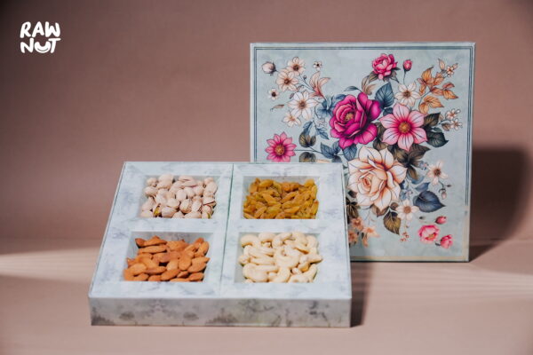 Celebrate special moments with the Sky Blue Floral 4 Compartment Box, featuring a premium selection of RawNut’s finest cashews, green raisins, pistachios, and California almonds. This beautifully designed box is perfect for gifting, offering a delightful and nutritious treat for any occasion.