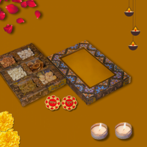 CelebrationsBlue Traditional Compartment Box – Cashews, Green Raisins, Almonds & Pistachios (with Complimentary Diyas & Shubh Laabh)